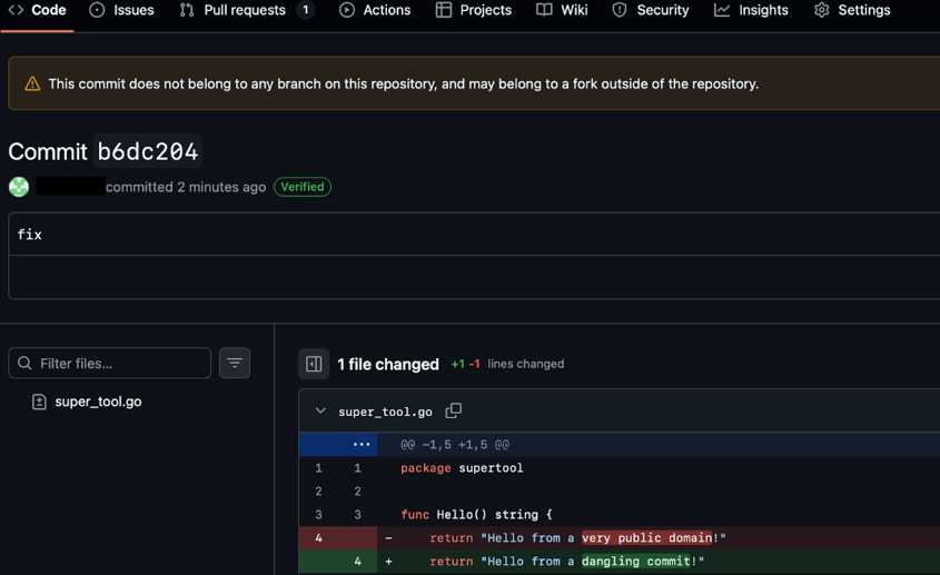 The commit is now "dangling", is no longer visible when browsing through the different branches on GitHub, accessible only via its hash [Fig. 5], but it remains permanently in the Go proxy.